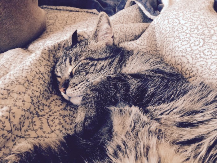 Jake has had lots of names.. he arrived on the scene here as ‘Dizzy’, then turned to ‘black balls’..for.. um..simple reasoning.. then came ‘Jake’, Then our friend from France came here, who connected with this cat like a long lost sibling, and it went to ‘Jacque La Chat’.. and trust me it is not pronounced the way you would think..so we stay with Jake.. I have been working at home on the ranch this week. Every morning a pretty little bird flies around the picture window as if he wanted in.. I would watch him and he would always settle for the hand railing next to the picture window. It would cock his head a hundred ways looking in the window, as if he was wanting to chat..it made me smile and happy to watch it. The kids would walk by and say “what a crazy bird”. I would laugh, “right?”..his hair stood straight upon the top of his head and he had pretty colors of cream all down his chest..anyway.. he visited me every am and sat on the railing checking out ‘the inside’. Fast forward to this am.. we had a bunch of rain last night and the air was nice and cool this am.. Sydney wanted out so I flung the sliding glass door open and left it open to get a little fresh air in. I was working away when I heard the blinds behind me shuffle around. I glanced back and didn’t see anything. It went back to peace and quiet with a few birds singing outside. I sat there for a few mins and pondered what I heard. I hollered for Sydney and she came walking by, looking like she just awoke and giving me her half dog smile. I got up and looked down at the blinds.. Jake had a 🐦 bird. “Jake!! You son of a bitch, drop it”. Sydney got interested with my raised voice, so she comes over and pokes her nose into it..Jake lets out his “rrrrrrrrrr”.. I said, “Jake, you are such an asshole..drop it”. Then Sydney figured out what was going on and then the race was on. Jake whipped his prize to the left as Sydney dove to the right, then to the right as Sydney dove to the left. This went on back and forth with me in the middle playing referee. I finally got them separated and Jake was in a corner still doing his, “rrrrrrrrrr”. I bend down to grab Jake and the bird to take them both outside. I looked at the poor bird, it was the same bird that had been stopping by every morning.. I laid into Jake again..”you son of a bitch, if you killed him you are kicked out”. I picked up Jake by his belly and ‘walked’ them outside. Sydney right on my heels. I went over to the edge of the deck and grabbed Jake by the scruff of his neck.. “let go you little bastard”, then by some grace he let go and the bird flew away..seemingly unscathed by the wanna be killer. Jake was all puffed up and ran under the deck chair on cue, maybe knowing an ass kicking was coming. Sydney was still looking around trying to figure out what had just happened.. my bird hasn’t been back since.. fricking Jacque La Chat..what an asshole..lol..